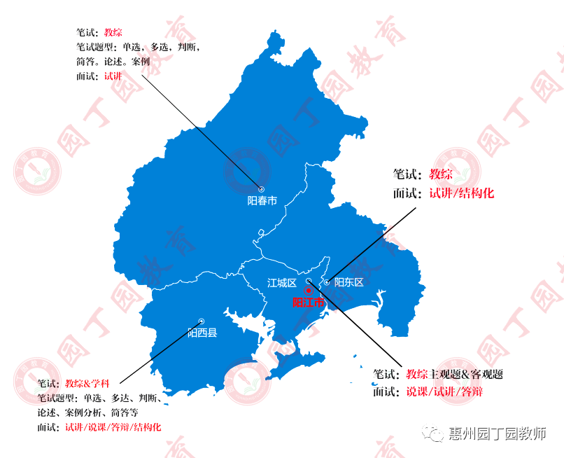 根据下方考情地图可以了解到,阳江教师笔试分为教综、教综+学科、学科三种,面试则为试讲、说课、结构化面试三种,其中试讲较为常考。