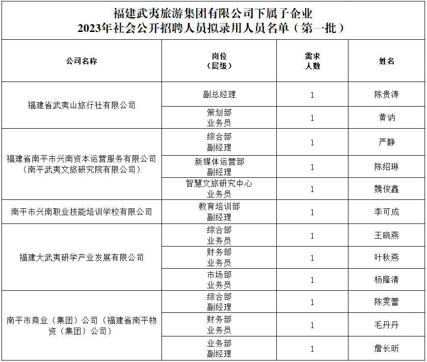 现将福建武夷旅游集团有限公司下属子企业2023年社会公开招聘拟录用人员名单(第一批)予以公示,公示期为2023年10月9日-10月13日。