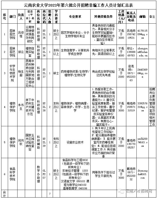 附件:云南农业大学 2023 年第六批公开招聘非编工作人员计划表