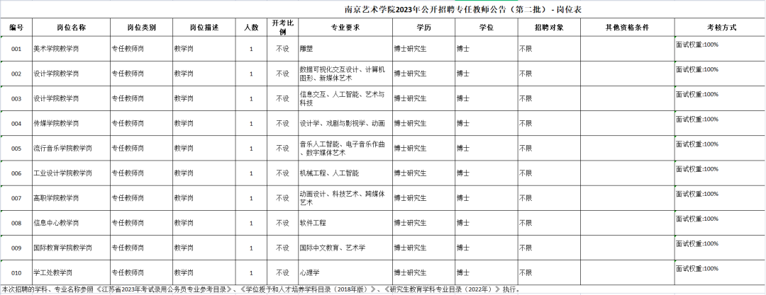(一)具有中华人民共和国国籍,遵守中华人民共和国宪法和法律。(二)遵纪守法,品行端正,团结协作,敬业乐群、廉洁奉公。(四)年龄要求为:博士研究生年龄不超过40周岁(即1983年1月1日之后出生),同时具有副高级专业技术职称的年龄不超过45周岁(即1978年1月1日之后出生),同时具有正高级专业技术职称的年龄不超过50周岁(即1973年1月1日以后出生)。(五)具备报考岗位要求的专业、技能等资格条件(详见岗位表)。本次招聘的应届毕业生须于2023年8月31日前毕业并取得学历学位证书,且仍无工作单位。2021年和2022年普通高校毕业生,若仍未落实工作单位,其档案关系仍保留在原毕业学校,或保留在各级毕业生就业主管部门(毕业生就业指导服务中心)、人才交流服务机构和公共就业服务机构的,以及国(境)外同期毕业且已完成学历认证但仍未落实工作单位的人员,可应聘应届毕业生岗位。国(境)外教学科研机构学习同期毕业人员,指在国(境)外教学科研机构学习,与国内应届毕业生同期毕业的留学人员,同期毕业的时间要求与国内应届毕业生一致。(六)取得祖国大陆普通高校学历的台湾学生和取得祖国大陆承认学历的其他台湾居民应聘时按国家和我省有关规定执行。应聘人员通过“江苏省属事业单位公开招聘平台”报名,照片上传、资格初审和缴费确认,均通过网络同步进行。报名网址:https://rs.jshrss.jiangsu.gov.cn/index/f/RCRS_0056(江苏省人力资源和社会保障厅网上办事服务大厅)1.报名、照片上传:10月9日9∶00-11月8日16∶00;2.资格初审:10月9日9∶00-11月9日16∶00;3.陈述申辩:10月9日-11月10日期间9∶00-16∶00;4.对初审异议的处理:10月9日9∶00-11月10日18∶00。(1)应聘人员网上提交报名信息24小时后(节假日顺延)可到报名网站查询是否通过招聘部门(单位)资格初审。(2)本次公开招聘不收报名费和考试费,通过初审即报名成功。(3)未按时在网上确认报名资格、上传照片的视为报名无效。1.应聘人员按岗位要求和网上提示,如实填写有关信息,并上传本人近期免冠正面二寸(35X45毫米)证件照,jpg格式,大小为20Kb以下。招聘部门(单位)根据应聘人员提供的信息进行审核。应聘人员弄虚作假的,一经查实,即取消应聘资格。2.招聘博士研究生岗位不设开考比例。自公告发布7个工作日之后,根据报名情况,自行组织考核。岗位招满即止。3.应聘人员只能从岗位表选择一个岗位报名。资格初审通过后,不可更改报名信息。未通过资格初审的应聘人员,在报名期内,可以改报符合资格条件的其他岗位。应聘人员要使用在有效期内的第二代居民身份证进行报名,报名与考场使用的身份证必须一致。②与事业单位负责人员有夫妻关系、直系血亲关系、三代以内旁系血亲关系或者近姻亲关系等亲属关系的,不得应聘事业单位的组织(人事)、纪检监察、审计财务岗位;与现有在岗人员存在上述关系的,不得应聘到岗后形成直接上下级领导关系的管理类岗位,以及《事业单位人事管理回避规定》明确应当回避的岗位;③新《江苏省事业单位公开招聘人员办法》于2020年3月13日起施行,根据其后发布的事业单位公开招聘人员公告,被聘用到江苏省地方各类事业单位3年服务期未满的在编(在册)人员;④2023年8月31日前,5年服务期未满的新录用公务员,或有规定(含协议明确)不得解聘离开工作单位(岗位)的人员,或国家和省另有规定不得应聘到事业单位的人员。(一)通过网上报名资格初审的应聘人员,学校将以电话、短信等形式将招聘考核时间、地点通知到应聘人员。应聘人员应按照规定的时间和地点参加考核。考核前进行资格复审,如有复审不通过人员不得参加考核,资格复审需提供以下材料:②国内应届毕业生提供所在院校出具的省级教育行政部门统一印制的《毕业生双向选择就业推荐表》原件及复印件;留学回国人员提供教育部留学服务中心出具的《国(境)外学历学位认证书》或相关证明材料原件及复印件。③毕业学校开具的专业方向证明(证明格式详见南京艺术学院人事处网站)。考核按照我校制定的办法进行。面试前由同行专家对应聘人员进行科研成果评审,并由校内用人单位对应聘人员进行材料审核或专业水平测试,按不高于1:3的比例进入面试,此两项不计分数。面试:主要测试履行岗位职责所需的专业知识、业务能力和综合素质。面试成绩当场公布,面试总分为100分,合格线为70分,不合格者不予录用。进入面试人员姓名、岗位、排名将在南京艺术学院人事处网站上公布(网址:https://rsc.nua.edu.cn/)。总成绩:应聘人员考核总成绩按百分制计算。博士研究生岗位总成绩=面试×100%,总成绩满70分以上为合格。总成绩不合格人员不予录用。考试结束后,根据总成绩计算方法确定应聘人员的总成绩,在各单项考试(测试)合格人员中,按招聘岗位拟招聘人数1:1的比例从高分到低分确定参加体检人员。体检标准参照《国家公务员录用体检通用标准(试行)》执行。对体检合格人员由用人单位组织考察,并根据考察和体检结果,确定拟聘用人员名单。拟聘用人员名单将在江苏省人力资源和社会保障网站、南京艺术学院人事处网站上公示7个工作日。公示内容包括岗位编号、招聘单位、岗位名称、拟聘用人员姓名、学历、专业、毕业院校、现工作单位、招聘考试的各项成绩、总成绩、排名等。因应聘人员考察或者体检不符合要求的,或拟