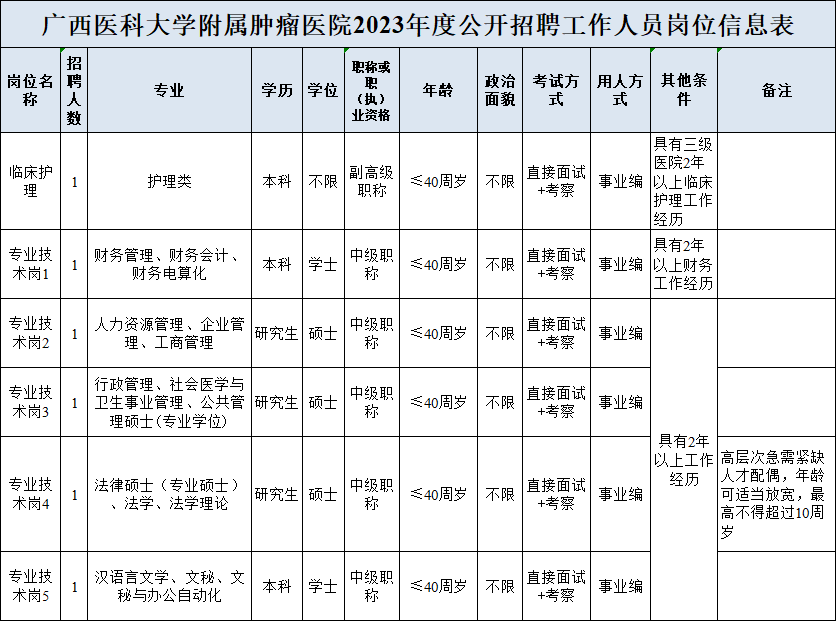 本次公开招聘实名编制工作人员6名,具体岗位要求详见《广西医科大学附属肿瘤医院2023年度公开招聘工作人员岗位信息表》(附件1)。