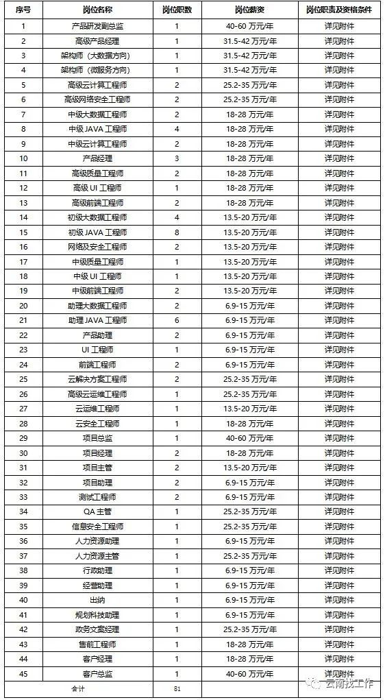 (二)岗位职责及资格条件详见附件《云南省大数据有限公司招聘岗位需求表.xlsx》。