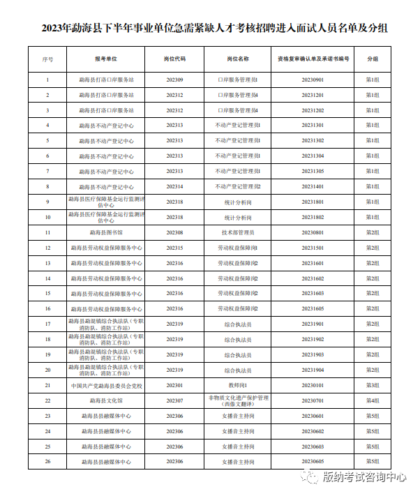 详见附件《2023年勐海县下半年事业单位急需紧缺人才考核招聘面试人员名单及分组》。