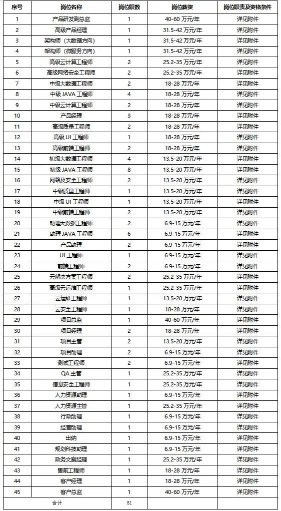 (二)岗位职责及资格条件详见附件《云南省大数据有限公司招聘岗位需求表》。