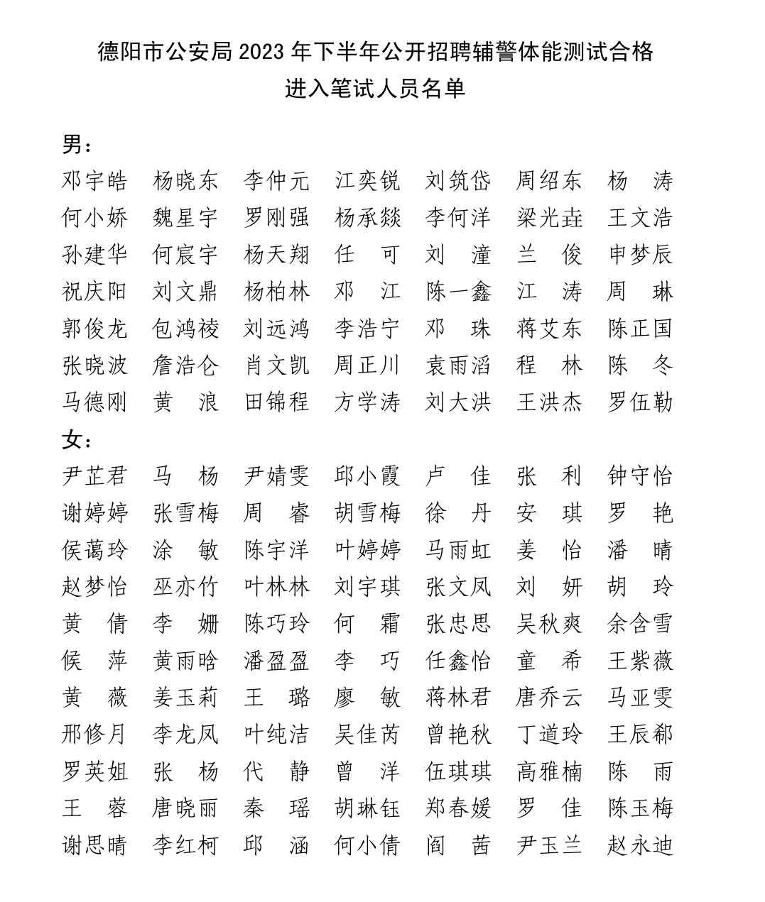 根据《德阳市公安局关于2023年下半年公开招聘警务辅助人员的公告》规定,现将体能测试合格,进入笔试人员名单及笔试相关事项公告如下: