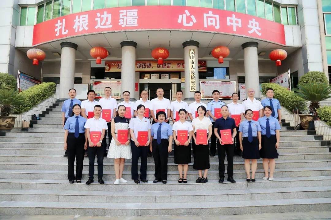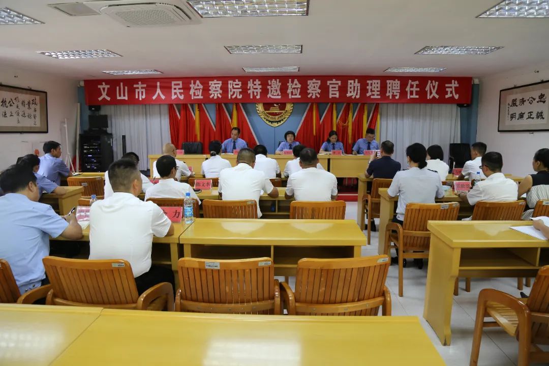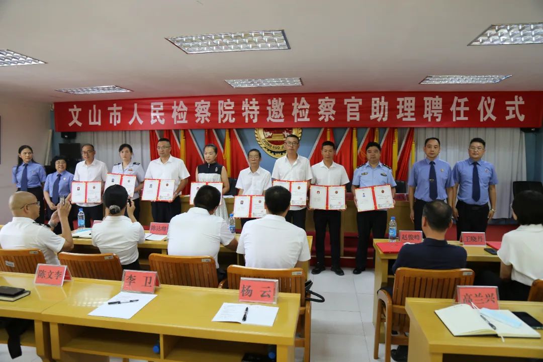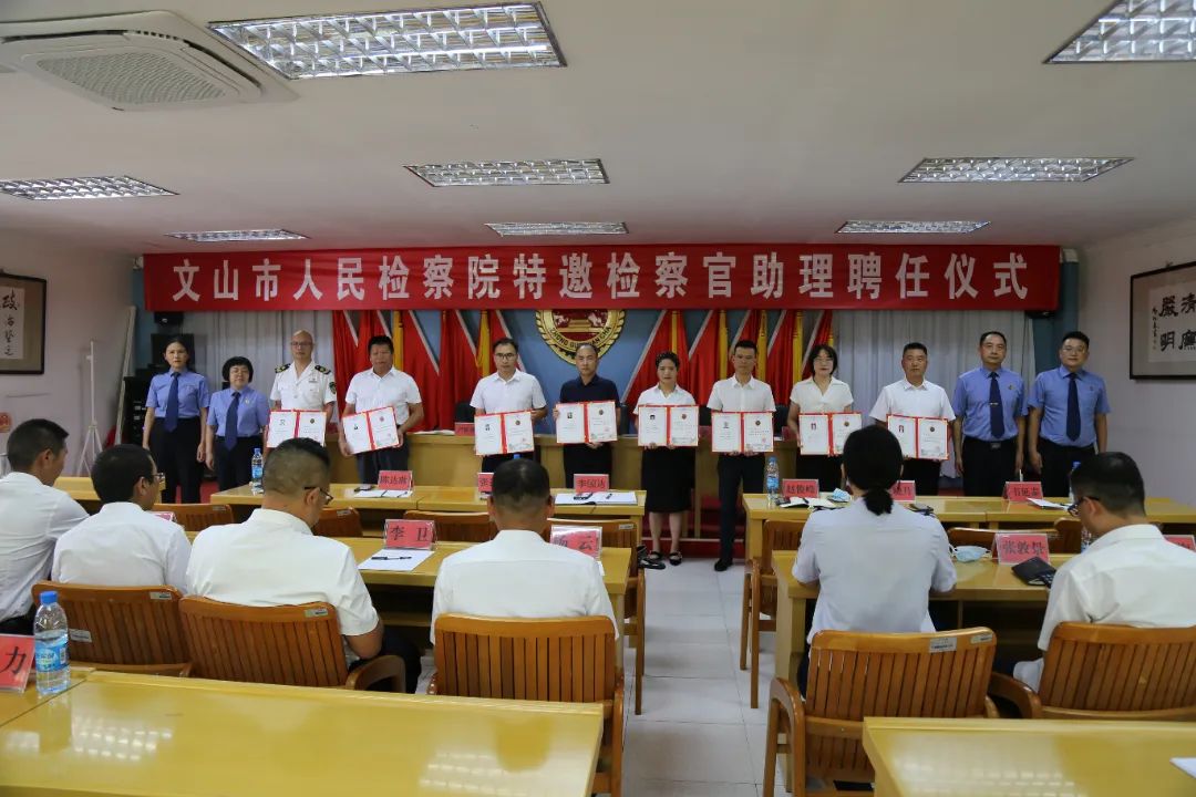 为进一步深化执法司法协作配合,提升检察办案专业化水平,7月15日下午,文山市人民检察院举行特邀检察官助理聘任仪式,聘请来自审计局、卫健局、市交通运输局等单位的17名行政机关、事业单位专业人员兼任检察官助理,院党组书记、检察长廖忠玲同志,党组成员、党总支书记、副检察长尹裕祥同志、专职检委委员罗云同志和政治部、办公室全体检察人员参加聘任仪式。