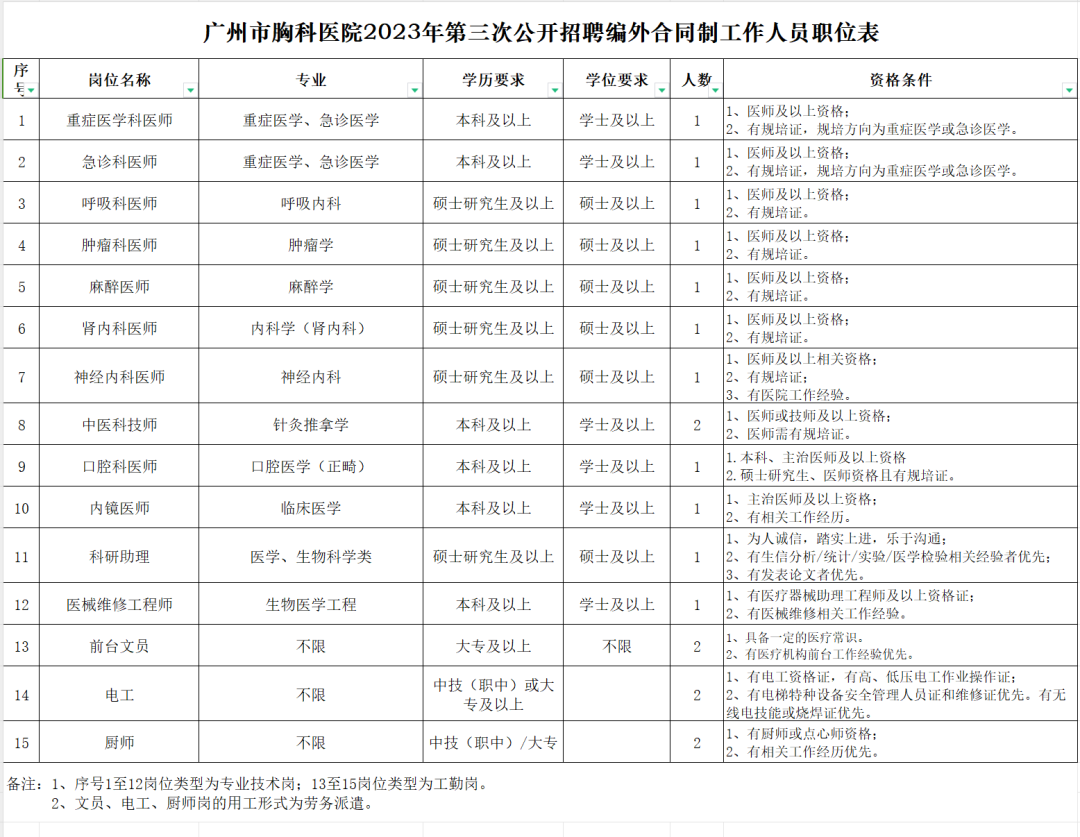 2.报名方式:登录我院招聘系统,注册填写个人简历后,点击相应岗位报名。(报名网址:http://120.236.104.54:4001/service/zhaopinFront/inviteJob.html)。3.考试方式:岗位报名人数超过招聘人数的10倍时,单位在应聘人员中择优筛选。考试考核方式、时间和地点以及面试后续通过邮件及短信通知,请留意。咨询电话:020-83586363,020-83590195地址:广州市越秀区横枝岗路62号(医院行政办公楼三楼人事科)附件:广州市胸科医院2023年第三次公开招聘编外合同制工作人员公告职位表.xlsx