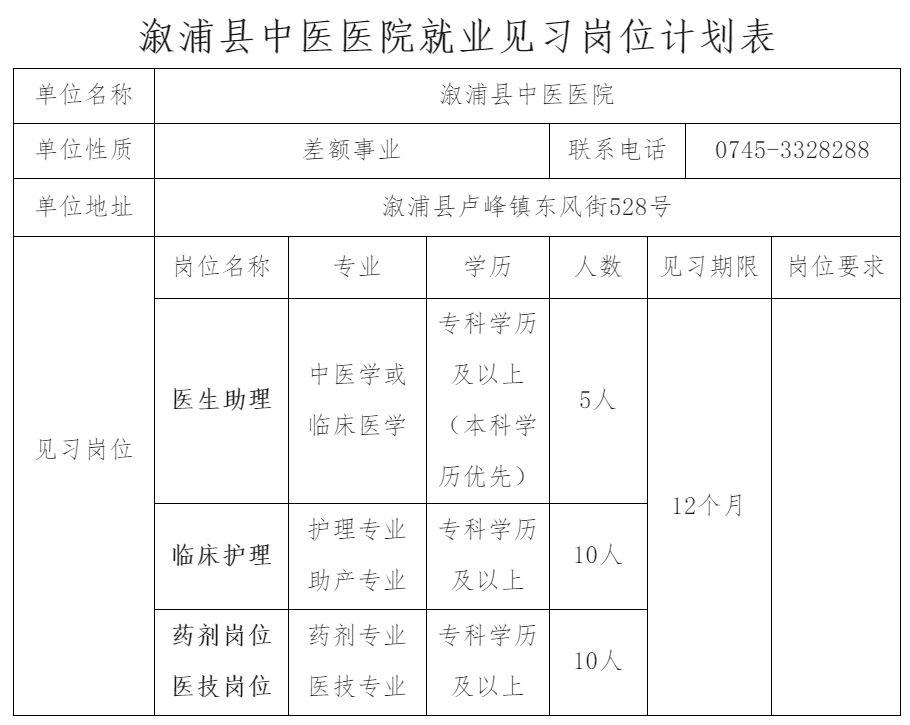 溆浦县中医医院是一所集医疗、教学、科研于一体的三级中医医院、国家爱婴医院、溆浦县区域医疗中心、溆浦县产科急救中心、怀化市正威司法鉴定所挂靠医院。现有在岗人员700人,开放病床800张,设有30个临床医技科室,其中省、市重点专科7个,为全县及周边县市100余万人口提供医疗卫生健康服务。目前新院区正在建设中(该项目占地151亩,建筑面积10万平方米,预算投资 5.6亿元),医院在习近平新时代中国特色社会主义思想指引下,沐浴着全面深化医改的东风,发展势头良好,发展潜力无限,发展未来美好。现因工作需要,根据湖南省人力资源和社会保障厅等10部门《关于进一步推进实施就业见习岗位募集计划的通知》(湘人社规【2023】9号)文件精神,面向社会公开招募25名见习人员。欢迎对中医学及临床实践有浓厚兴趣的青年朋友加入我们的团队。经过见习期的培训和实践,将有机会成为我院的优秀医疗人才,具体岗位及招募条件如下: