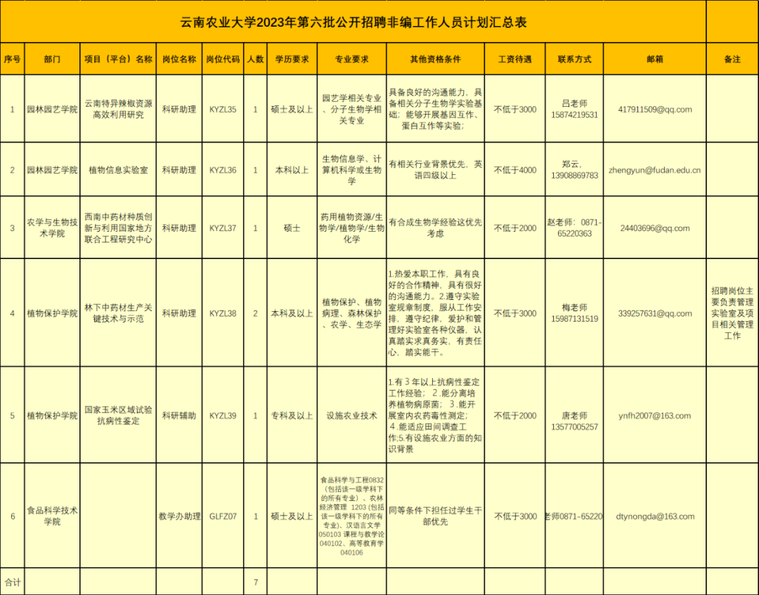 因工作需要,云南农业大学面向社会公开招聘非编工作人员7名(详见招聘计划),现将有关事宜公告如下: