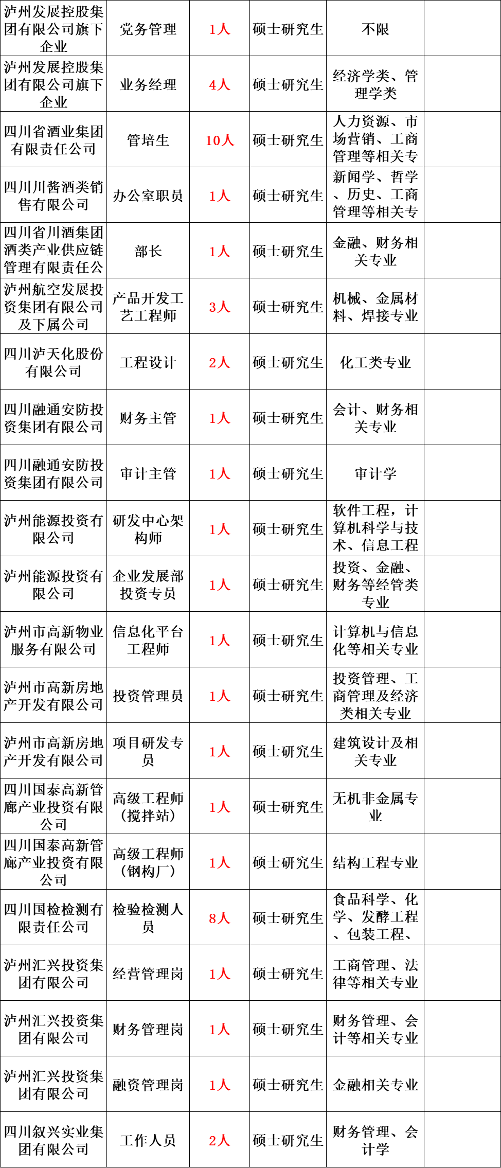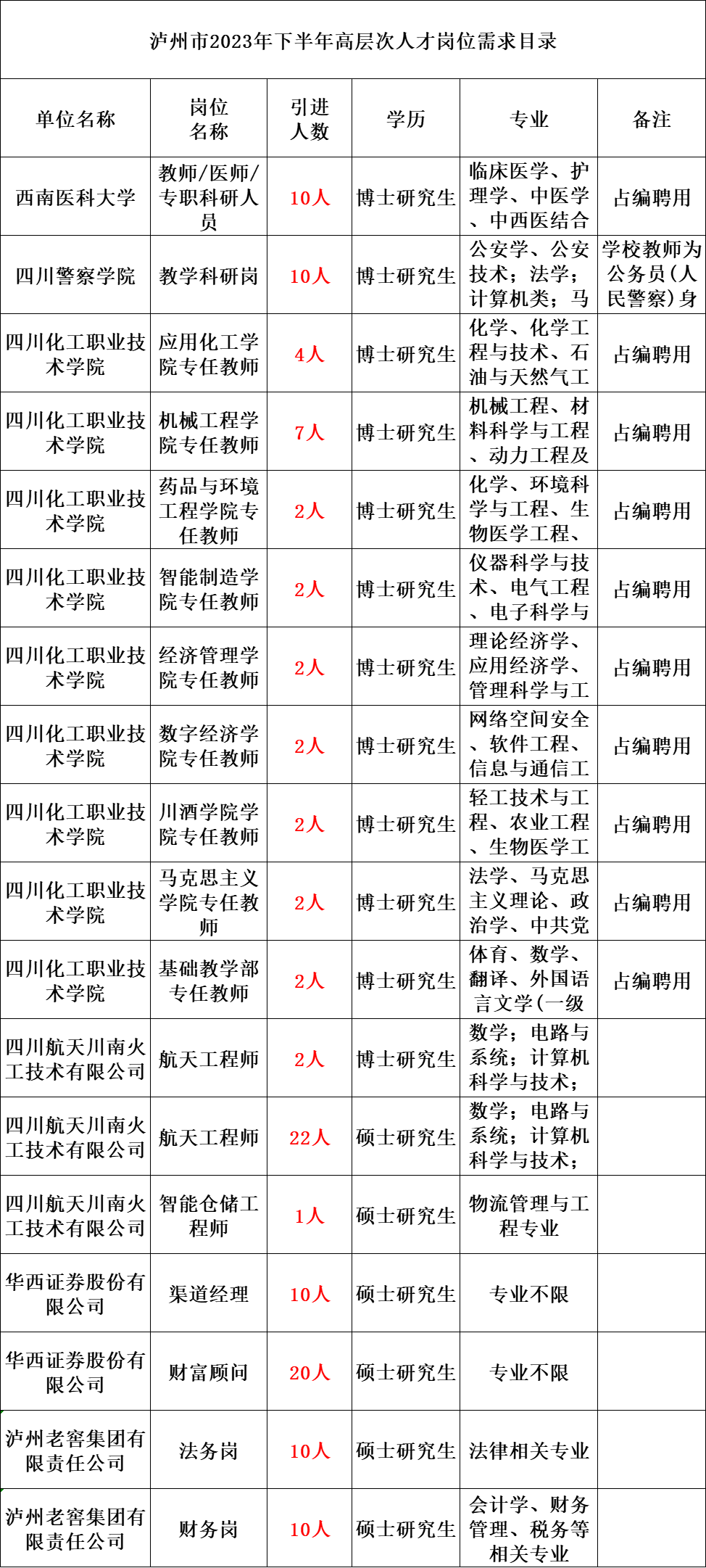 本次泸州市企事业单位共拟引进11268名急需紧缺人才点击获取职位表,具体详见附件中的岗位需求目录(赴各高校招聘的岗位计划,以当次招聘活动明确为准)。