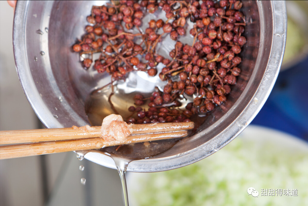 3、下面再加上盐、五香粉,把肉馅搅拌好以后,放到一旁腌制片刻。接下来我们还需要准备适量的料油,往锅内倒入食用油,加上花椒和葱姜,将其炸出香味之后,把香料捞出来,再把料油倒出来晾凉。