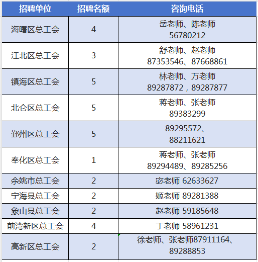 根据工会工作需要,今年宁波市共公开招录职业化工会工作者35名,具体招录单位和名额如下: