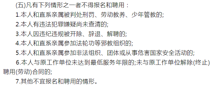(四)凡考生未在规定时间内按要求参加体能测试、笔试、资格复审、面试、体检、政审、报到等情况的,均视为自动放弃应聘资格;资格审核贯彻招聘工作全过程,在任何环节,发现考生不符合招聘条件,弄虚作假的,取消应聘资格,问题严重的要追究相关责任。