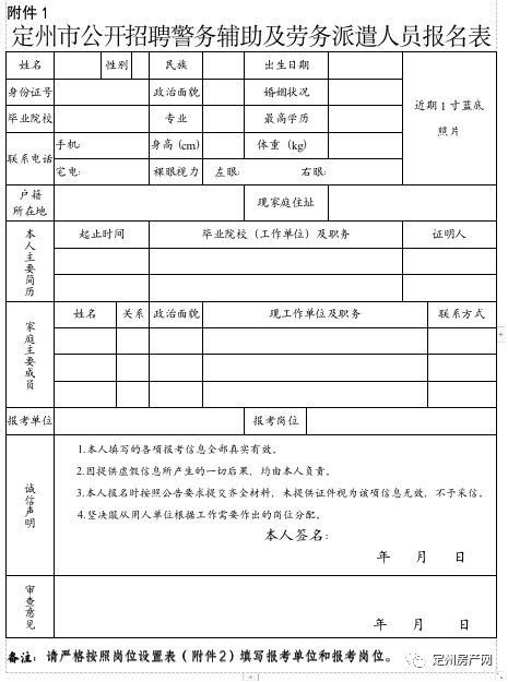2.资格复审须知:进入资格复审人员须携带二代身份证、户口本、毕业证、学信网《教育部学历证书电子注册备案表》原件及复印件各一份,《定州市公开招聘警务辅助及劳务派遣人员报名表》(见附件)一份,按放宽条件报名的退役军人、退出国家综合性消防救援队伍的救援人员需提供相关证明材料。