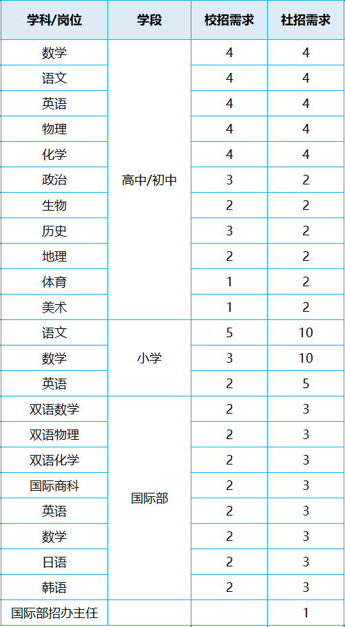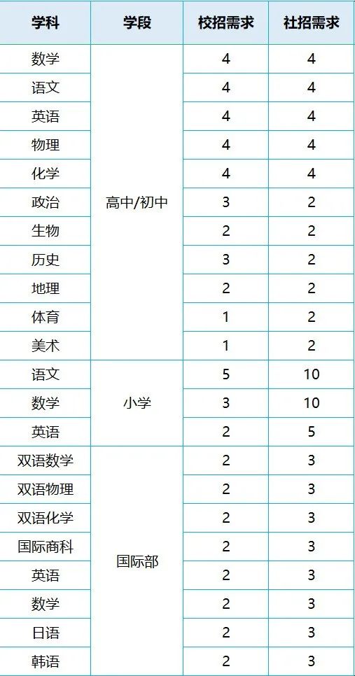 高中 语文教师 | 2-3人 | ①硕士研究生: 普通高等院校2023、2024年毕业的硕士研究生,取得相应学历学位。 ②博士研究生: 取得相应学历学位的博士研究生。 ③优秀在职老师: 中学高级职称(特别优秀者可放宽至中学一级职称)。 |