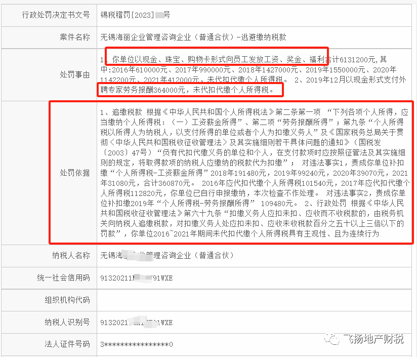 处罚事由:1、你单位以现金、珠宝、购物卡形式向员工发放工资、奖金、福利合计6131200元,其中:2016年610000元、2017年990000元、2018年1427000元、2019年1550000元、2020年1142200元、2021年412000元,未代扣代缴个人所得税。2、2019年12月以现金形式支付外聘专家劳务报酬364000元,未代扣代缴个人所得税。