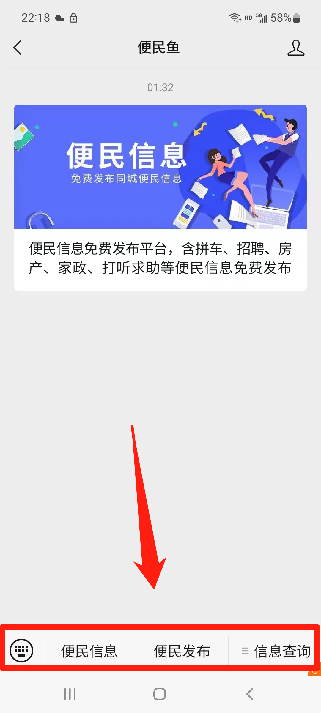 在便民鱼微信公众号:根据您的需求点击底部菜单栏即可免费发布信息。