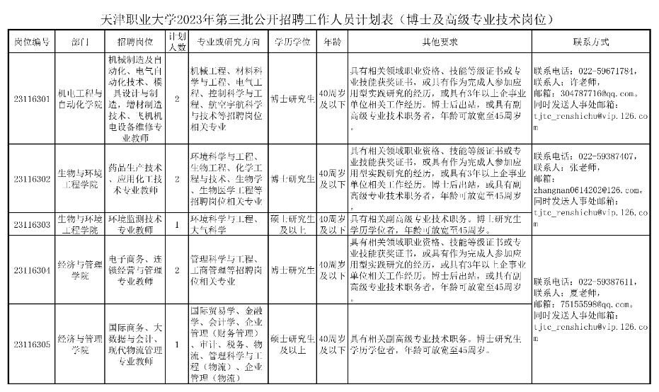 二、【天津职业大学2023年第三批公开招聘工作人员方案(博士及高级专业技术岗位)】