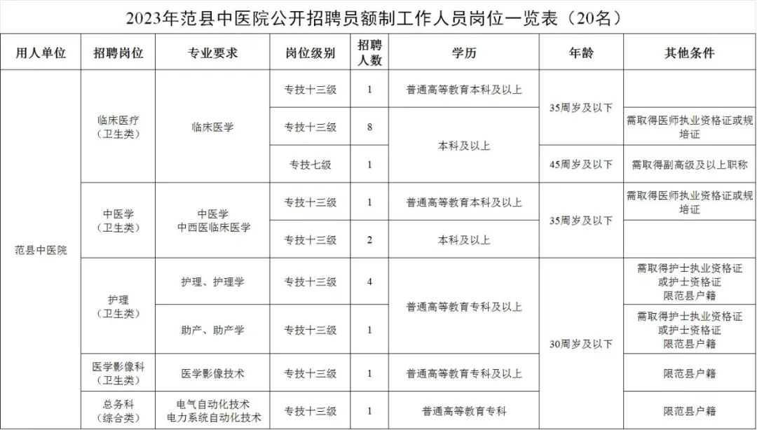 1. 2023年范县中医院公开招聘员额制工作人员岗位一览表