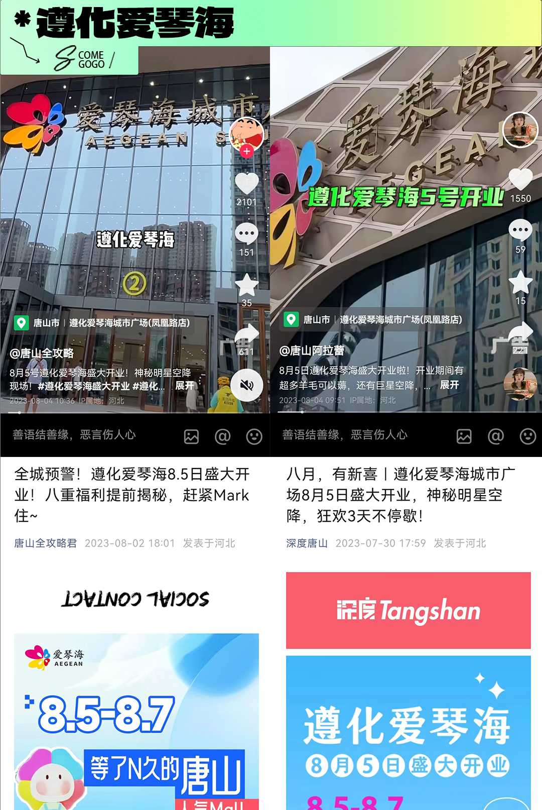 河头老街、唐山宴、大城山“运动之山”、唐山马拉松、霸王茶姬、奈雪的茶、太阳城、中骏世界城、唐山吾悦广场、遵化爱琴海、嗨皮水世界、唐城·壹零壹、巴黎贝甜等等,那些你耳熟能详的品牌,每一次的创意碰撞,都让我们灵感迸发。