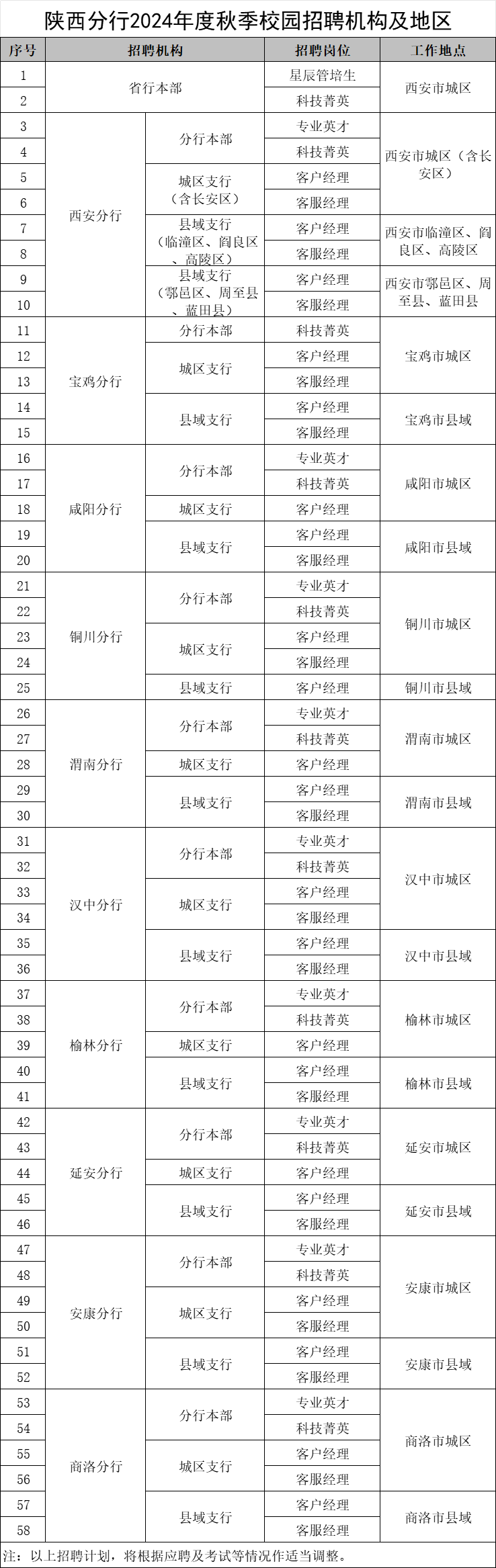 新员工报到后分配到就业协议书中确定的工商银行陕西分行所辖机构工作,具体招录机构及地区详情见《中国工商银行陕西省分行2024年度秋季校园招聘机构及地区》