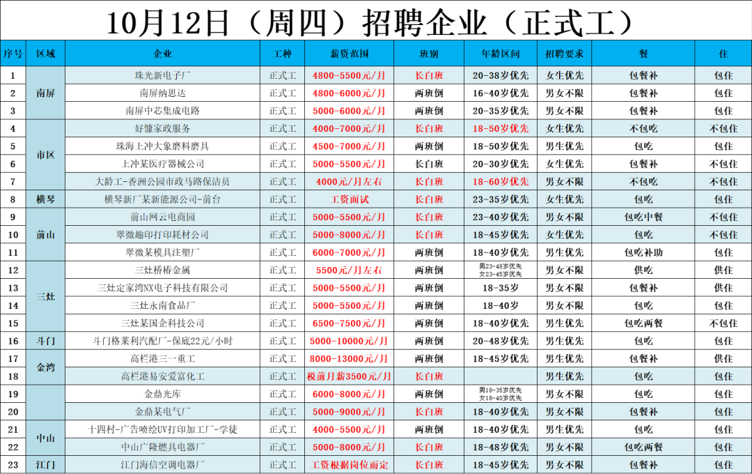 长白班,包吃(2元/餐)住(平摊水电费) ,4-6人/间或6-8人/间,8-11小时/天,当天安排宿舍