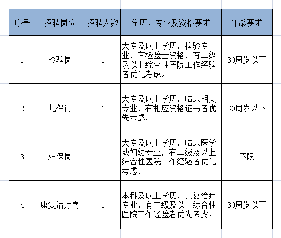 根据医院工作需要,经研究决定,遂川县中医院面向社会招聘4名合同制专业技术人员,岗位为检验岗、儿保岗、妇保岗、康复治疗岗,现将有关事项公告如下: