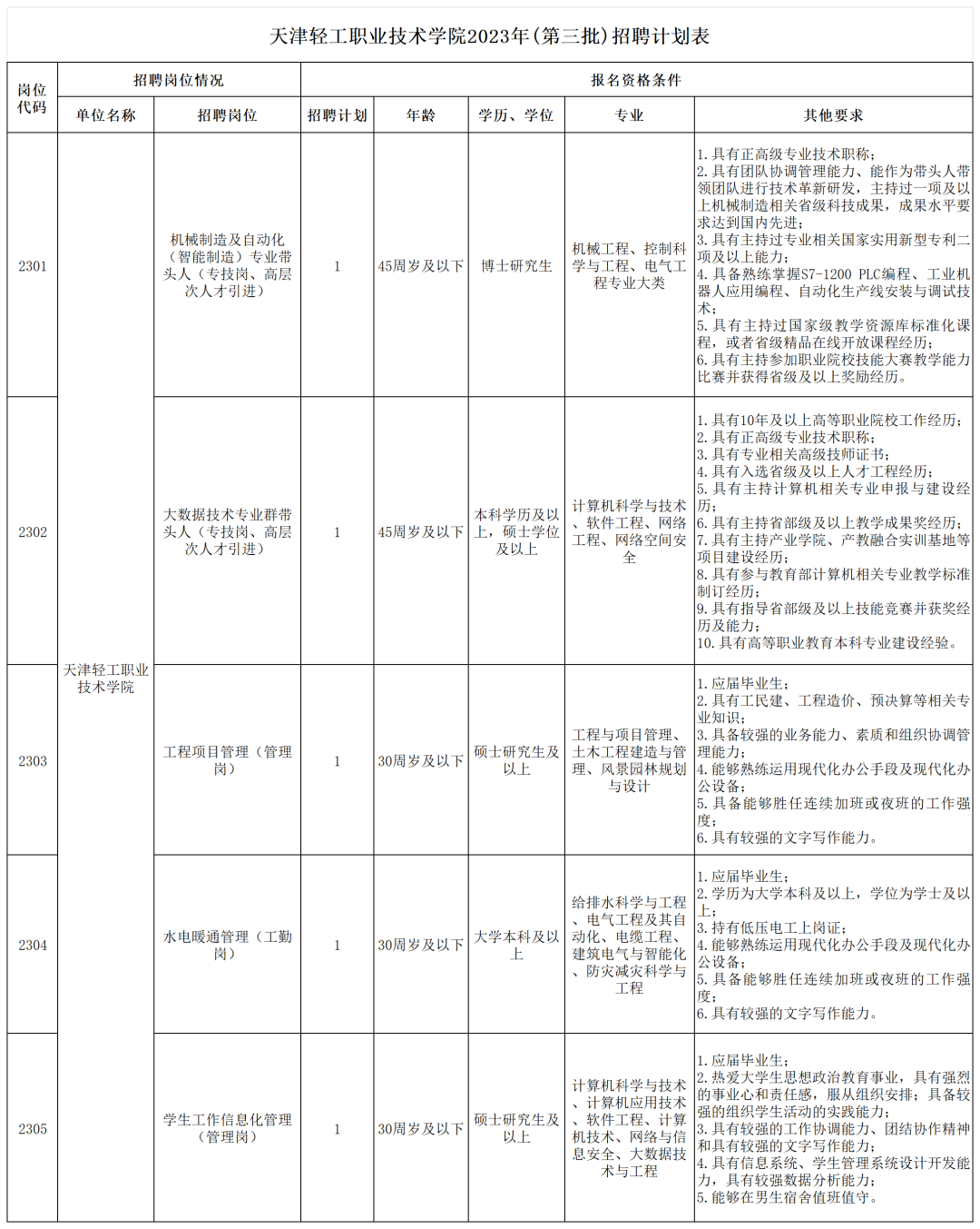 【天津职业大学2023年第三批公开招聘工作人员方案(博士及高级专业技术岗位)】