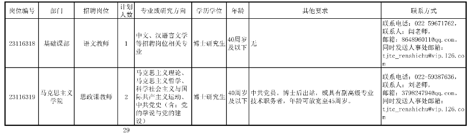 ☑本次公开招聘将采用邮件报名的方式进行,邮件主题为“岗位编号+姓名+手机号”。请应聘人员将报名表word版及其他支撑材料制作成两个附件后发送至相应部门邮箱及人事处邮箱tjtc_renshichu@vip.126.com。