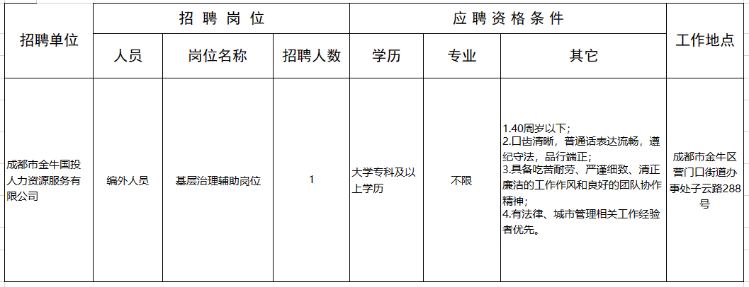 金牛区营门口街道办事处编外工作人员1名(其中:基层治理辅助岗位1名、负责城市管理工作)。