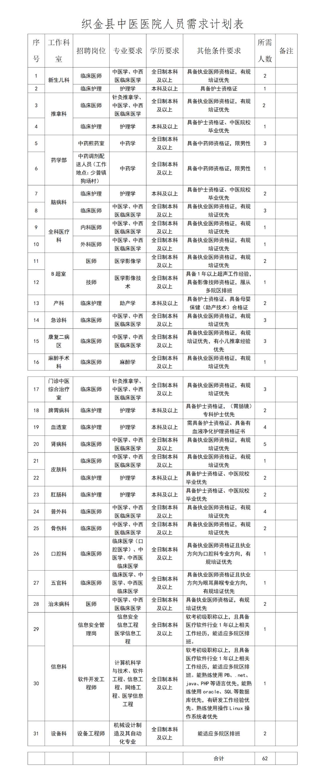 为进一步加强我院人才队伍建设,做好“三级中医医院”创建工作,根据《织金县中医医院招聘管理制度》、《织金县中医医院2023年人才工作计划》内容及我院工作实际需求,拟在2023年10月第三批面向面向社会公开招聘编外医务人员62名(详见招聘职位表)。现公告如下:
