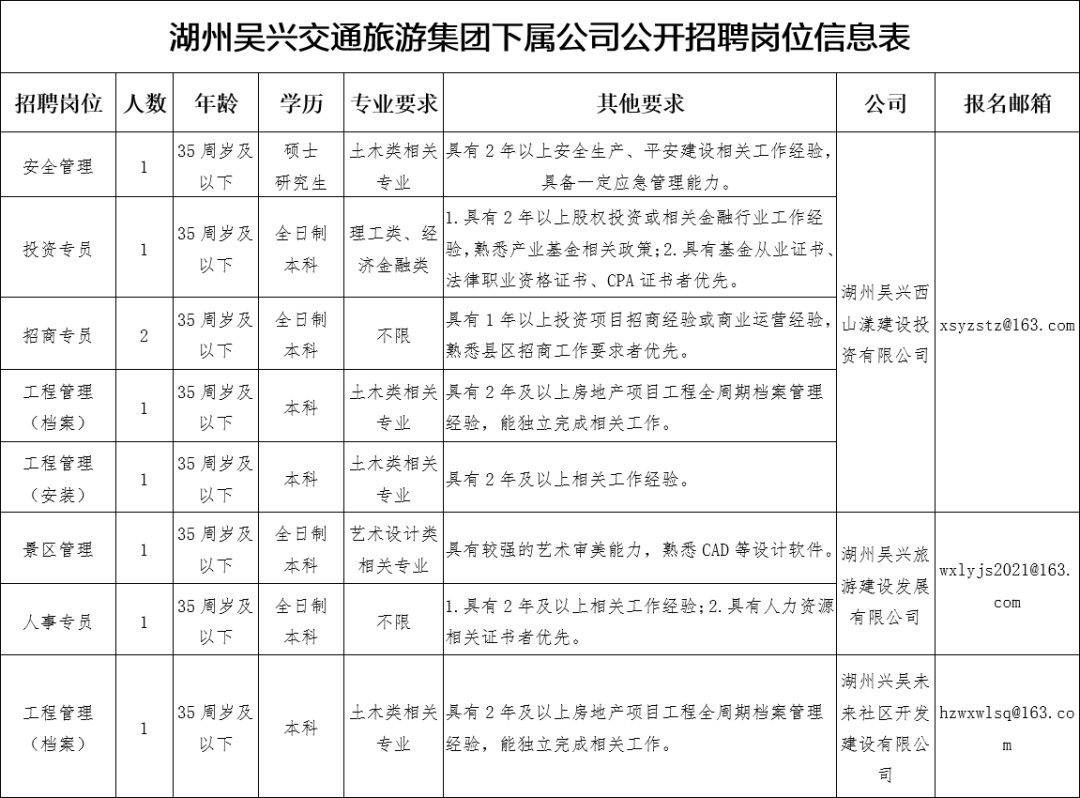 湖州吴兴交通旅游投资发展集团有限公司(简称“吴兴交旅投集团”)是按照吴兴区委、区政府的统一部署,整合交通和旅游相关资产组建的现代化大中型国有企业集团,总资产205亿元,下属36家子公司,其中一级子公司13家。目前集团业务版板扩大至交通建设、文旅开发、城市更新、科创服务,现根据下属公司业务发展需要,拟向社会公开招聘工作人员,现将有关事项公告如下: