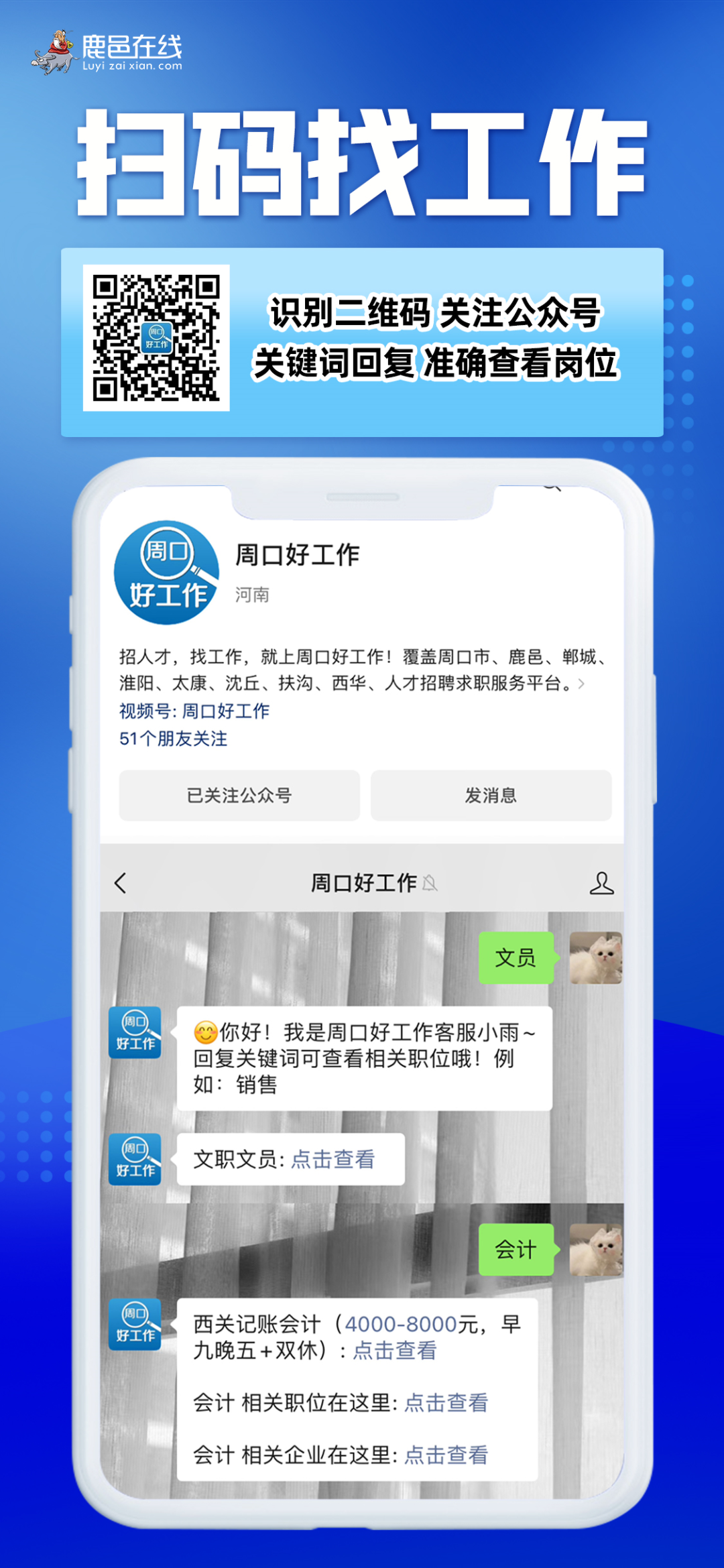 越来越多的求职者信任周口好工作平台,越来越多的鹿邑企业商家通过周口好工作平台招聘招到所需的优秀人才。【周口好工作】鹿邑本地的求职招聘平台,添加客服微信在线为您推荐本地好工作,找工作快人一步,拉您进【鹿邑求职招聘工作群】更多岗位等您挑选!