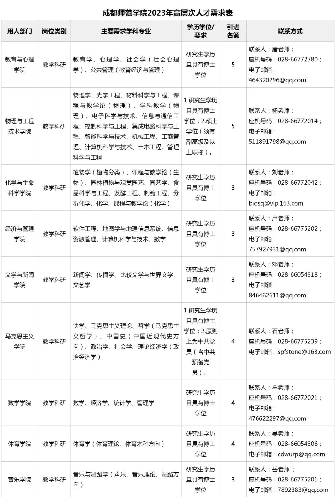 本次人才引进采用网络报名方式进行,应聘人员将个人简历发送至相关电子邮箱(具体见《成都师范学院2023年高层次人才需求表》联系人一栏)。