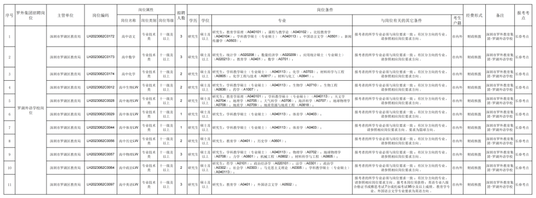 罗湖外语学校(简称罗外高中)共24人,岗位表如下: