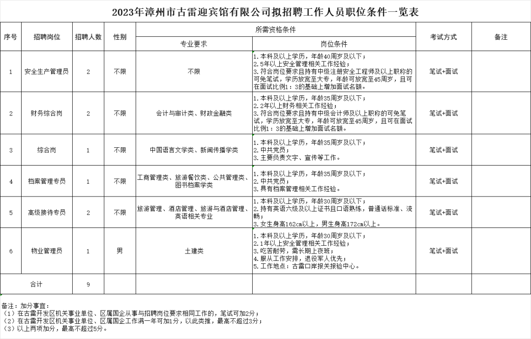 具体加分事宜详见《2023年漳州市古雷迎宾馆有限公司拟招聘工作人员职位条件一览表》。笔试卷面分达到合格线方可享受加分待遇。有关加分材料请于报名时提供完整并上传至报名系统,未上传的按不加分处理。