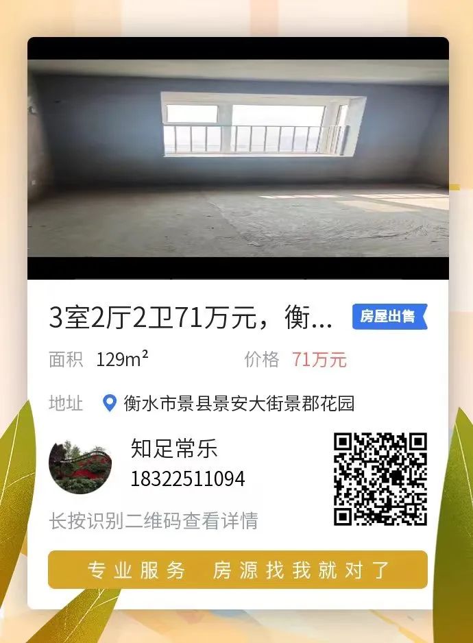【房屋出售】3室2厅2卫71万元,衡水市景县景安大街景郡花园 景郡花园15层电梯好楼层,129.7平三室两厅两卫,南北通透户型方正,采光好视...10月17日