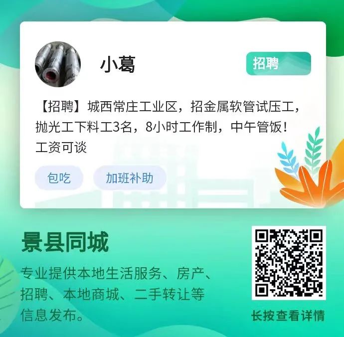 【招聘】 城西常庄工业区,招金属软管试压工,抛光工下料工3名,8小时工作制,中午管饭!工资可谈10月24日