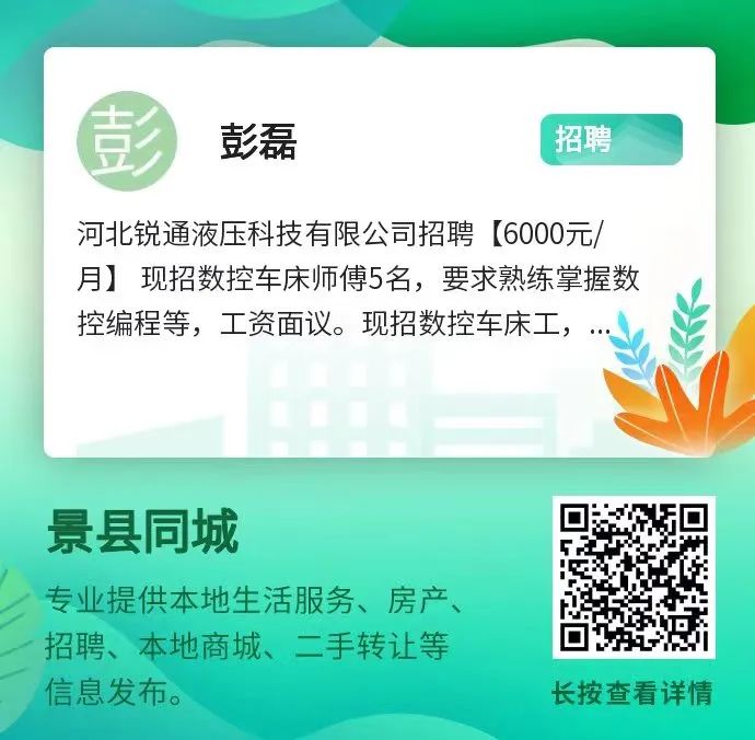 【招聘】 招全自动台钻工,数控车床工,勤杂工 ,男女都可以 计时计件都可 工资:4000-6000 地址:景县广川大街西头河北龙煤机...10月08日