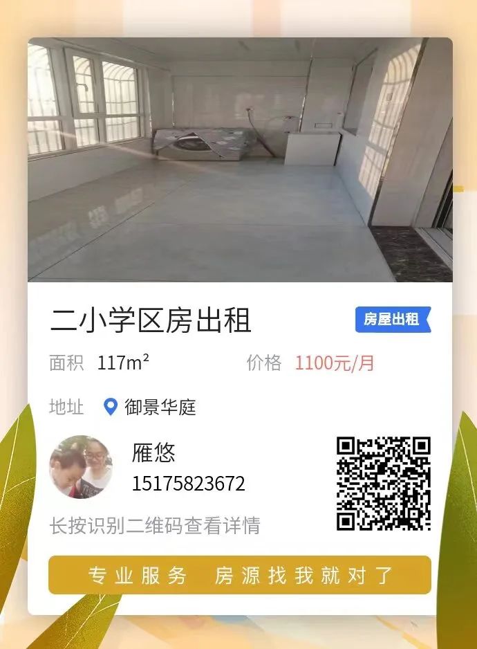 【房屋出租】二小学区房出租 御景华庭 二小学区房 全阳面 3室2厅1卫,家电家具齐全 拎包入住 离联小也比较近 交通便利 生活设施齐全10月27日