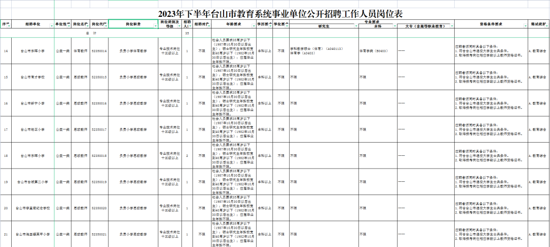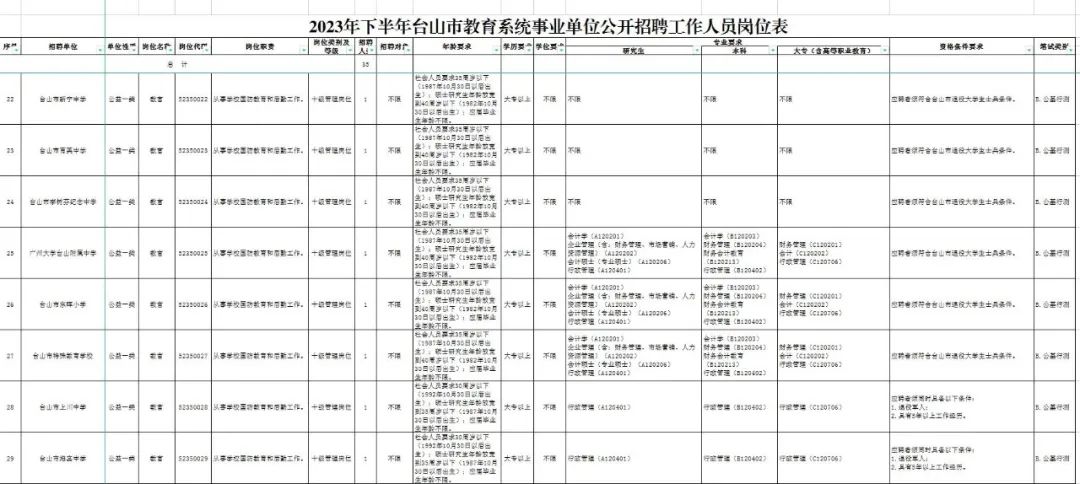 具体招聘岗位详见《2023年下半年台山市教育系统事业单位公开招聘工作人员岗位表》(附件)。应聘者可登录相关网站或者点击阅读原文查询相关招聘信息。