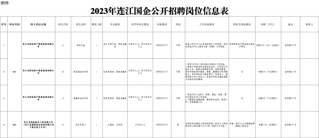 本次共公开招聘工作人员4名,具体招聘人员岗位及其资格条件详见附件一:《2023年连江国企工作人员公开招聘岗位信息表》。