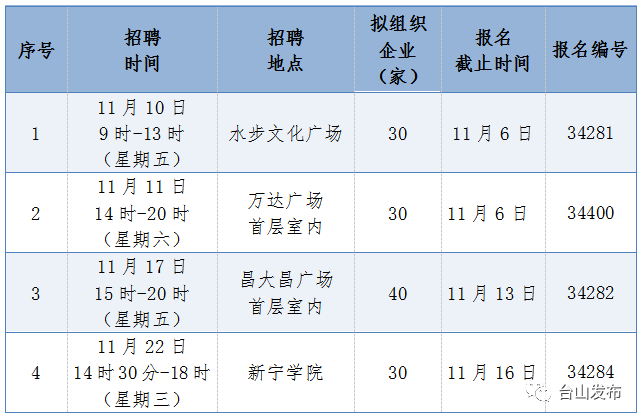 为贯彻落实党的二十大精神,坚持落实党中央、国务院关于就业工作决策部署和省、江门市关于就业等十大民生工程安排,强化就业优先政策,扎实推进我市“百千万工程”,根据上级有关文件精神,我市于2023年10月-11月开展2023年台山市“金秋招聘月”就业服务活动,其中10月份已陆续开展组团赴外招聘、台山市“零工市场”和“就业驿站”专场招聘及相关专场线上招聘,11月将组织4场市内现场招聘活动。