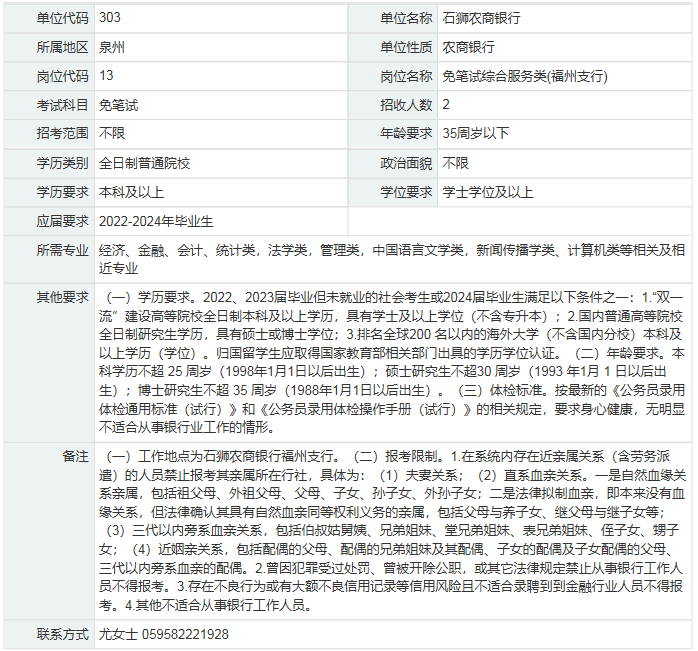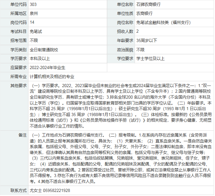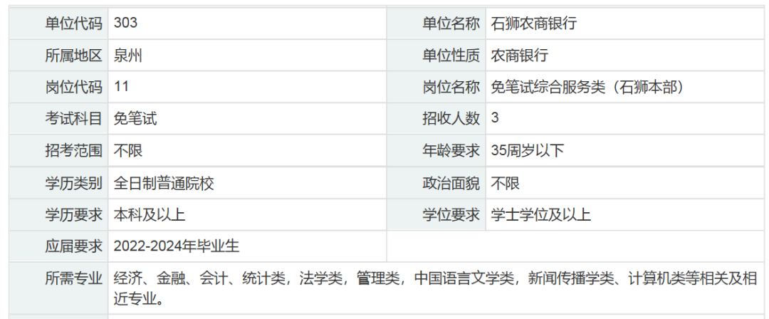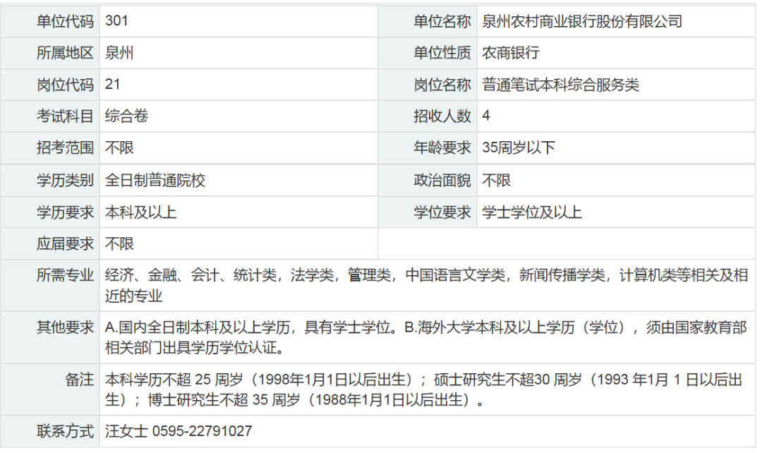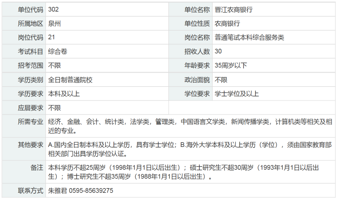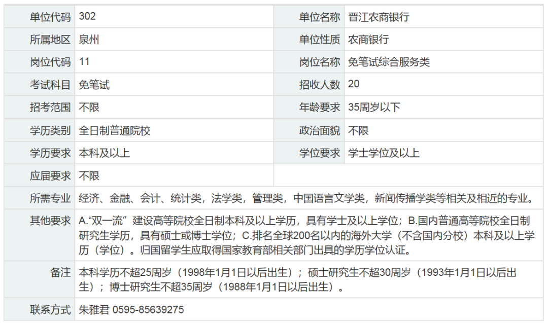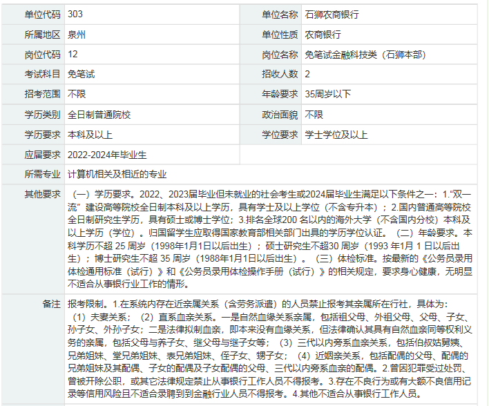 | 简历筛选: | 符合条件的社会考生至多可报名3个岗位,其中免笔试类1个,笔试类2个岗位,如考生在笔试岗位中被多家行社审核通过,报名截止后,福建农信将通过短信、电话等方式与考生确定最终报考意向,未通过简历筛选考生不再另行通知(简历筛选期间,请各位考生保持通讯畅通,以便接收补充报名信息资料的通知)。 |