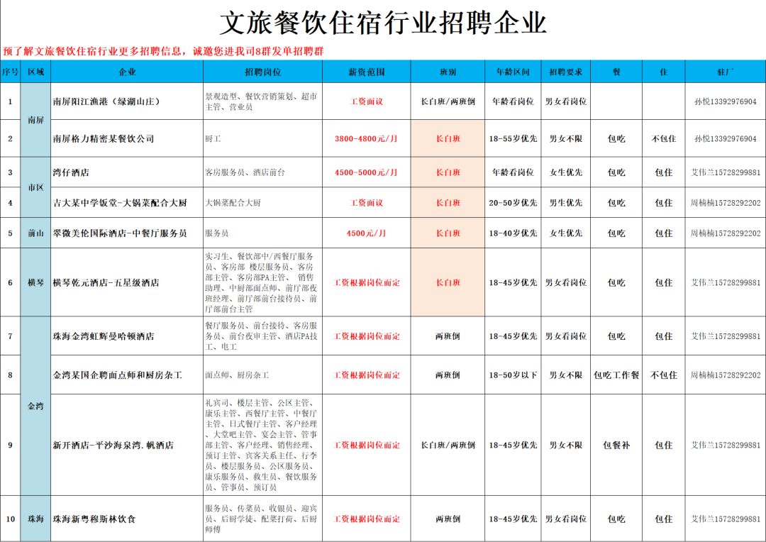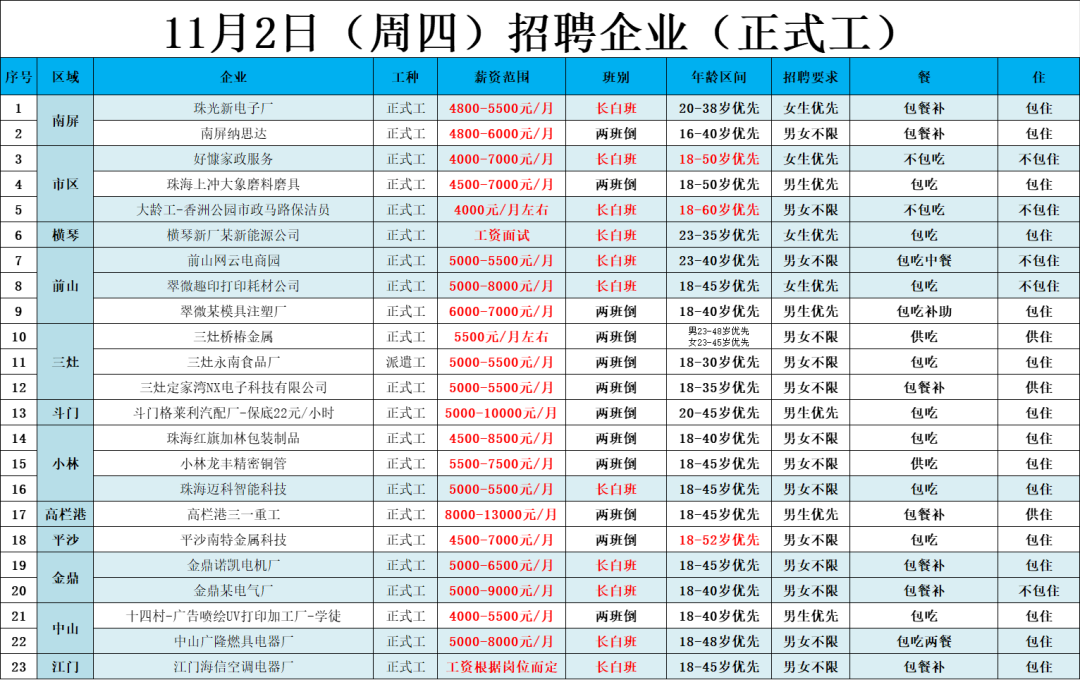 • 长白班,包吃(2元/餐)住(平摊水电费) ,4-6人/间或6-8人/间,8-11小时/天,当天安排宿舍