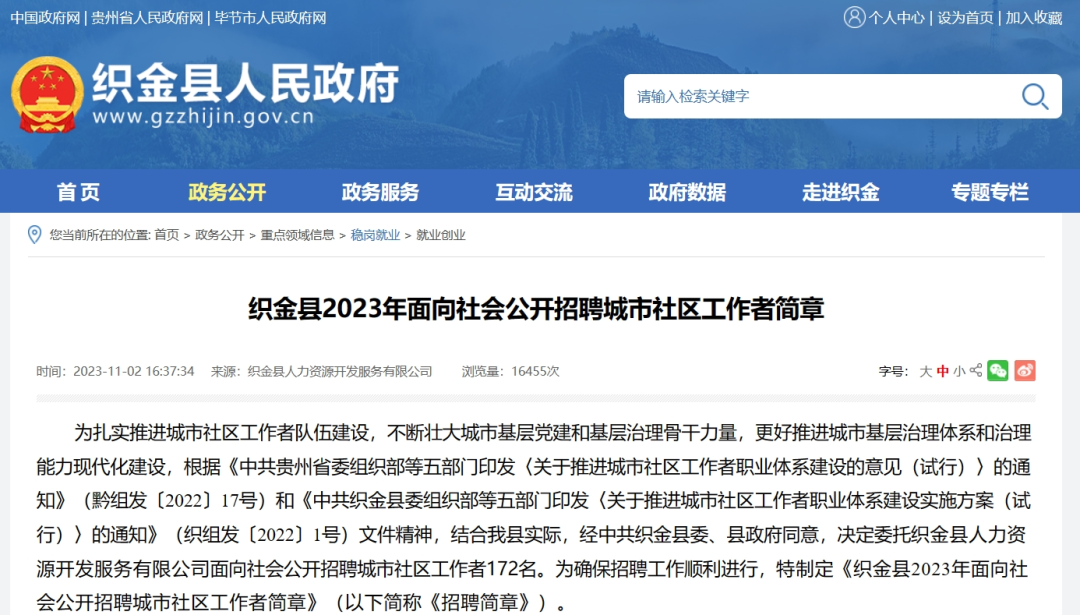 2023贵州织金县招聘城市社区工作者172人简章