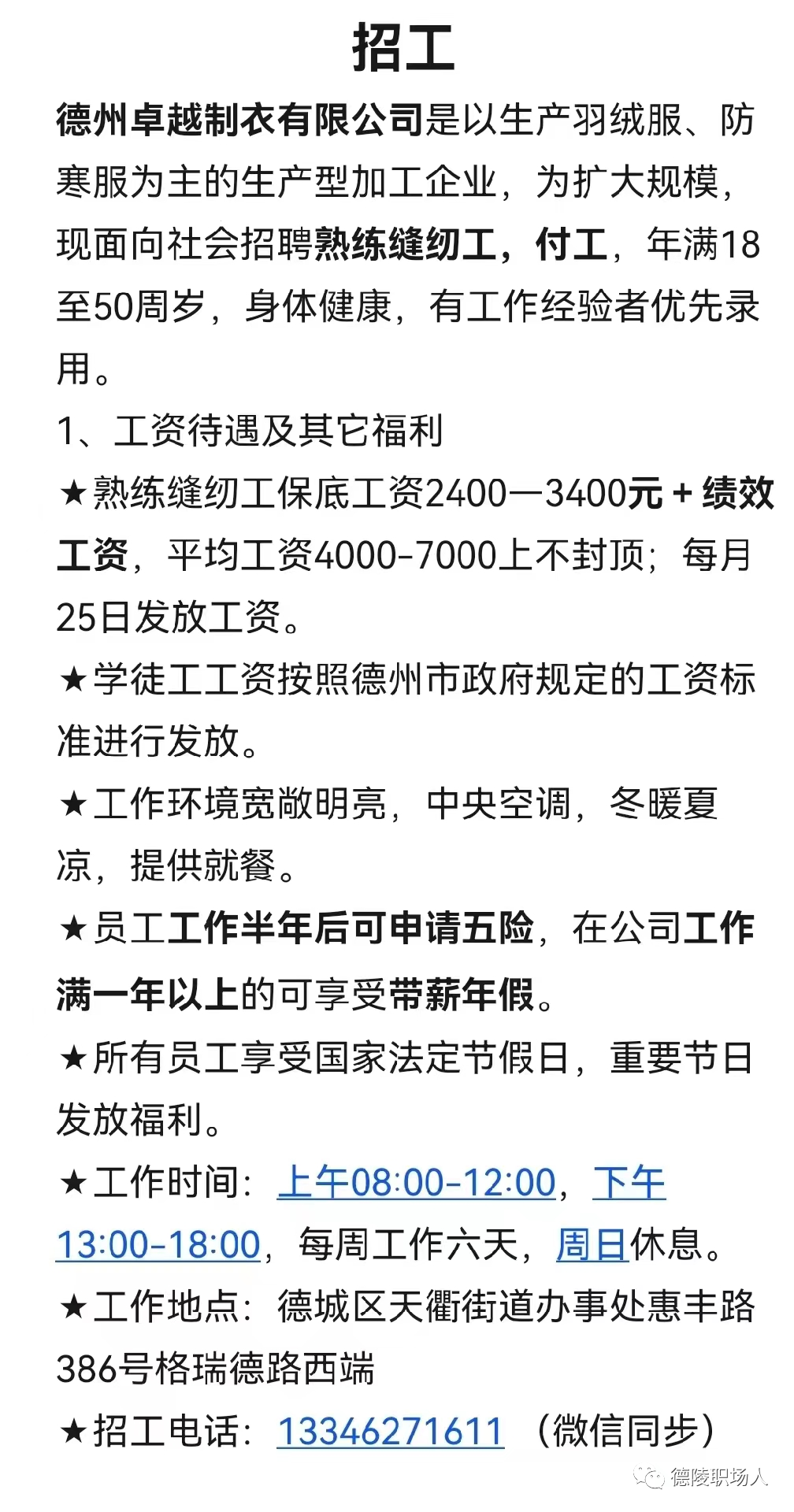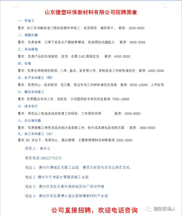招聘 钳工、钻床、抛光工 普工、5-15人(可招学徒), 一年以上相关工作经验 待遇月休2-3天 薪资:计件 5000-10000 左右 公司免费提供住宿,免费提供一日三餐,缴纳五险。地址:山东省德州市陵城区天衢东路与崇德十一大道交叉口西200米