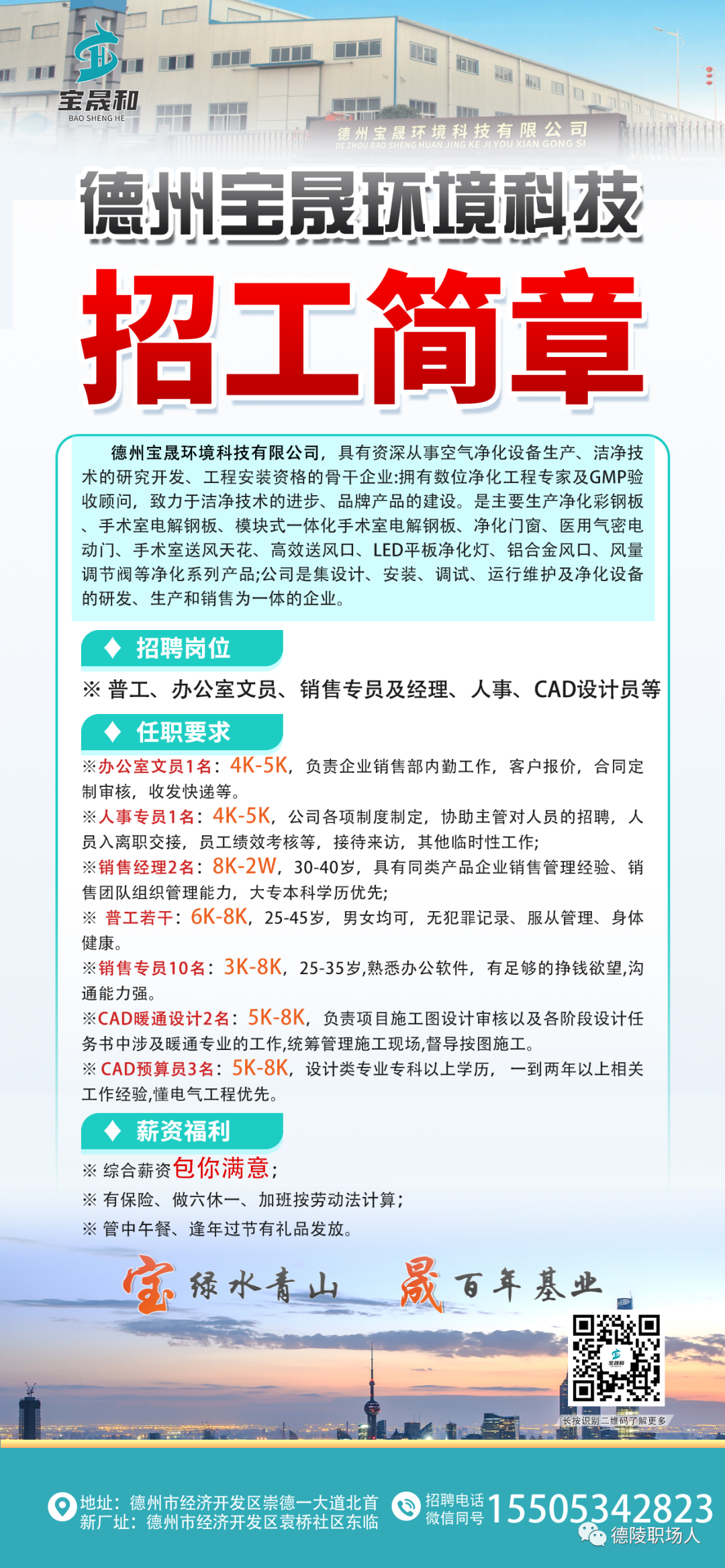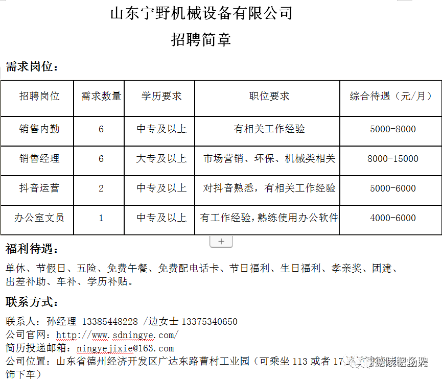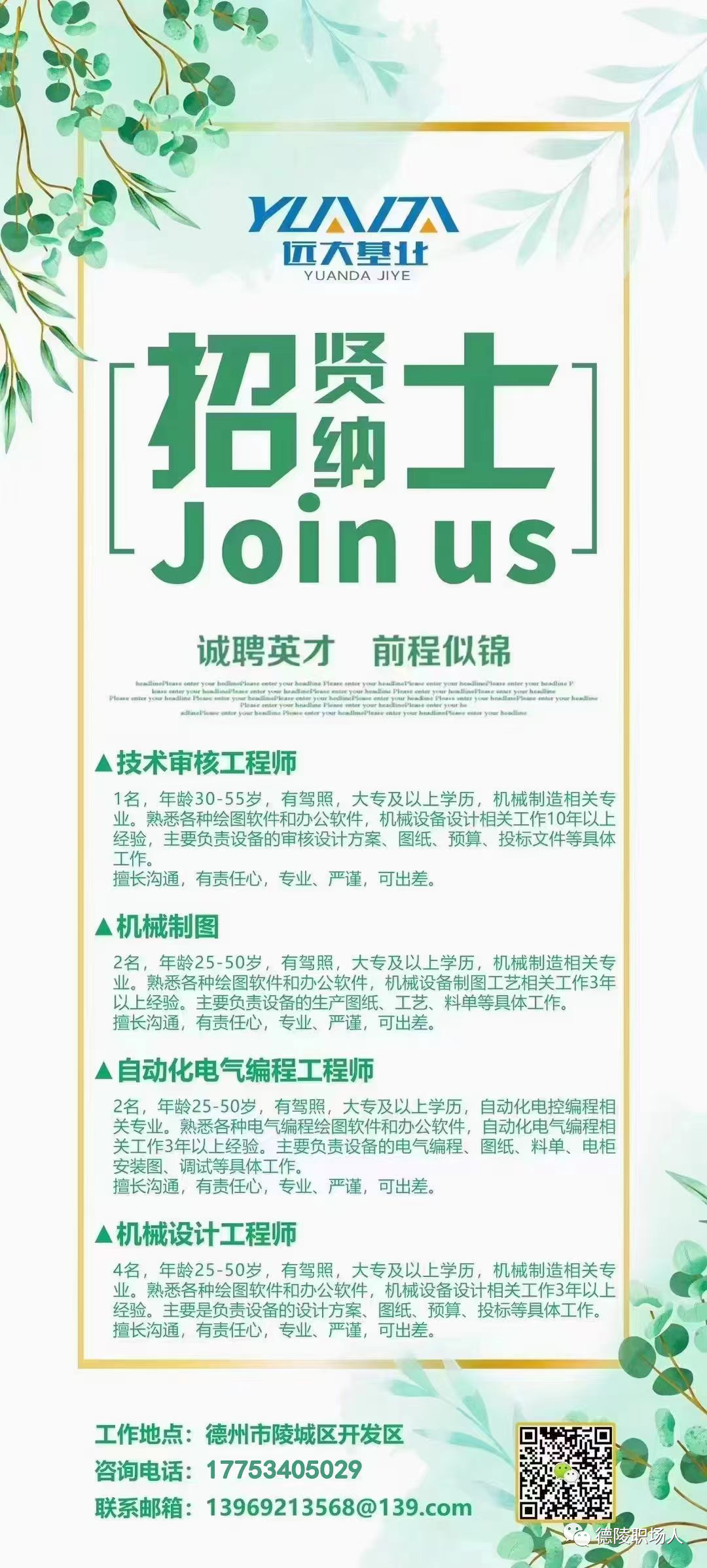 15、生产计划员1名,年龄25到40周岁,要求大专及以上学历,有相关工作经验;16、设备主管1名,年龄25到48周岁,要求有相关工作经验;就业岗位信息二十三: