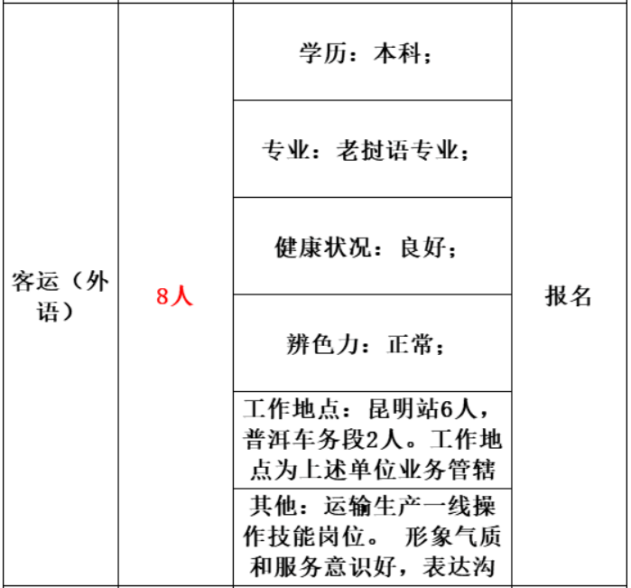 5.服从中国铁路昆明局集团有限公司及所属用人单位对岗位、工作地点的安排和调整,能够适应铁路单位工作环境和岗位工作要求。