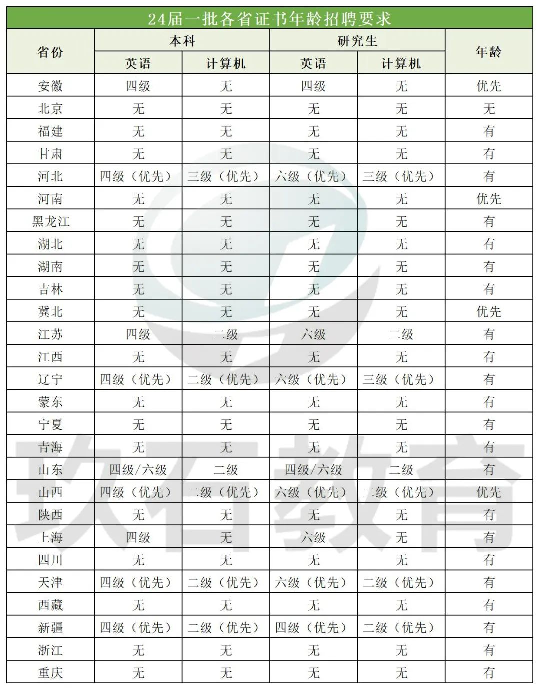 证书要求:河北、辽宁、山东、山西、天津、新疆等省份对英语成绩有优先政策或者硬性条件要求,大部分省份对证书无明确要求。